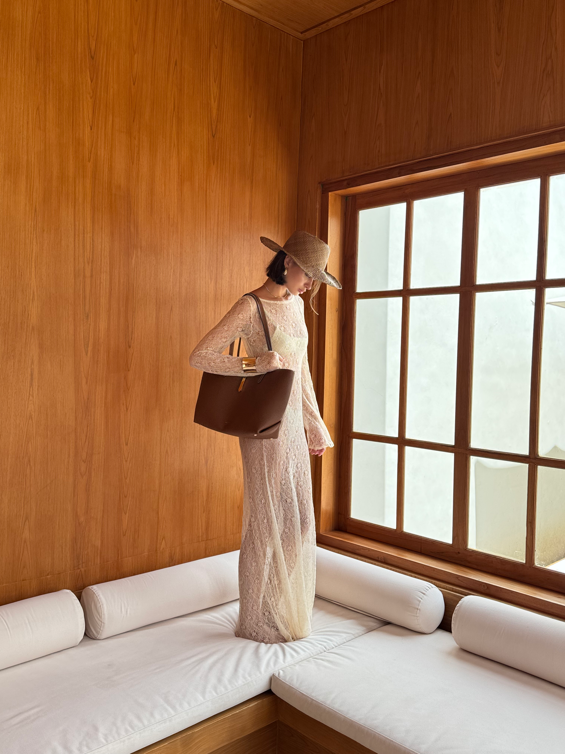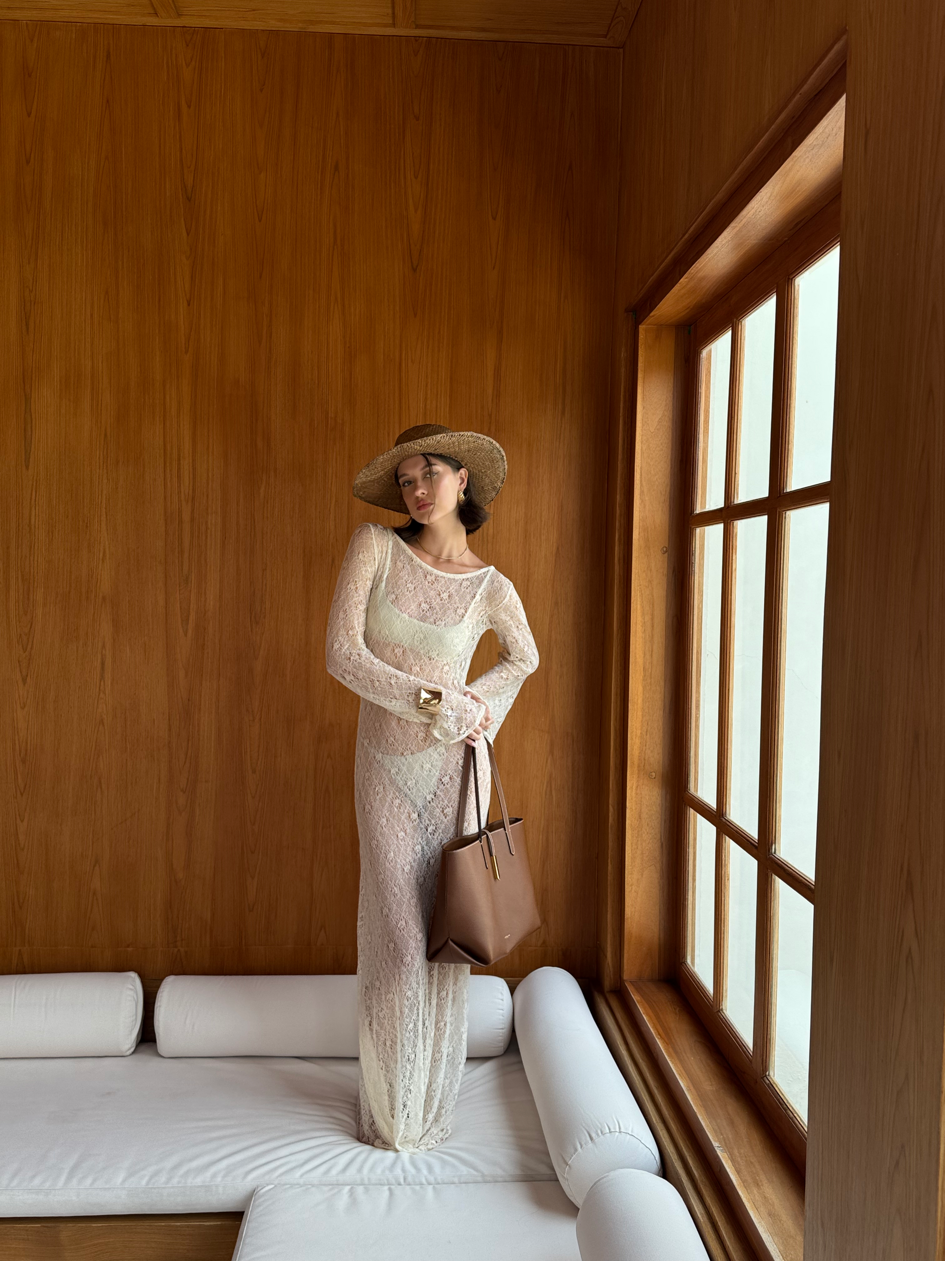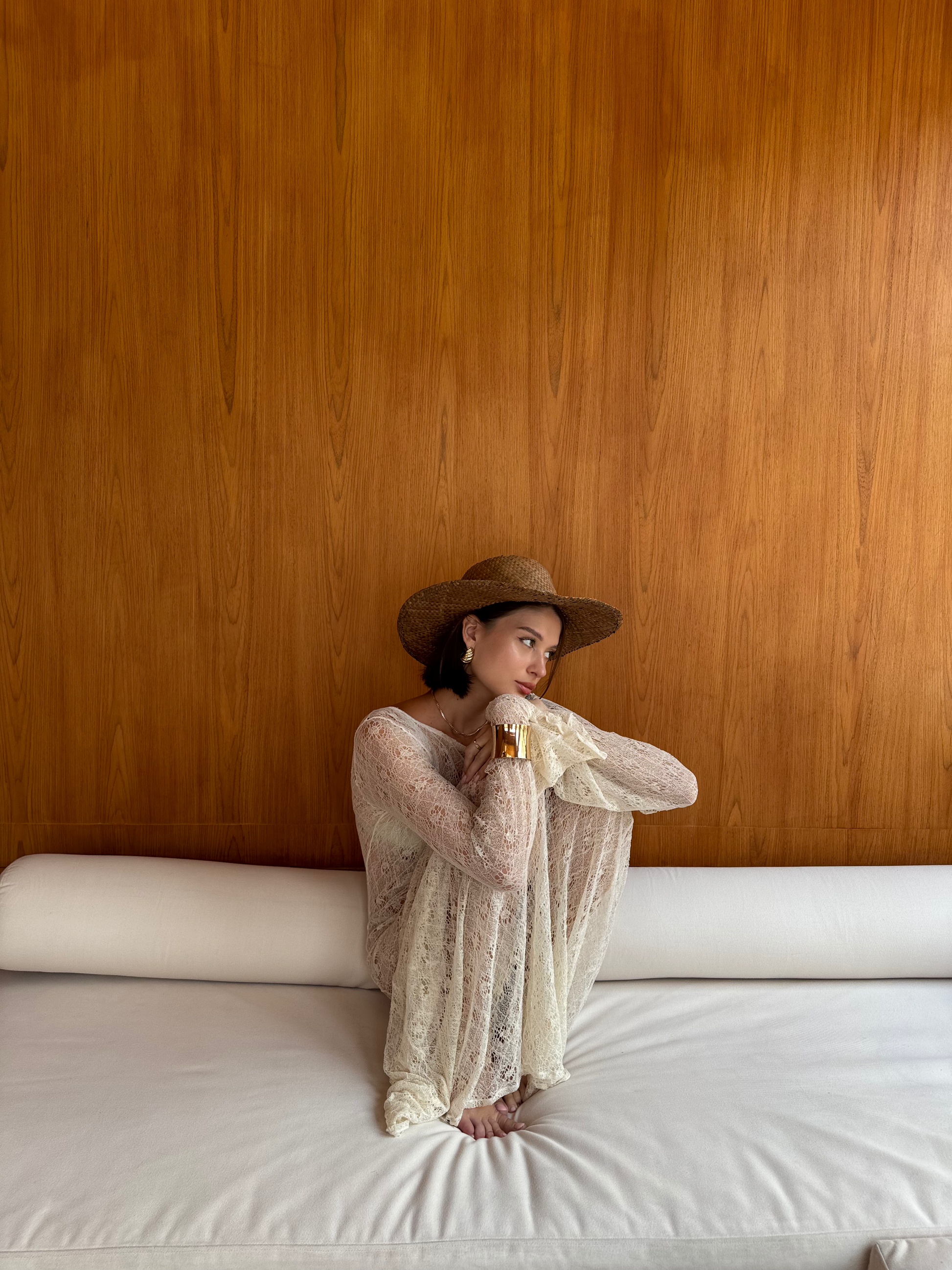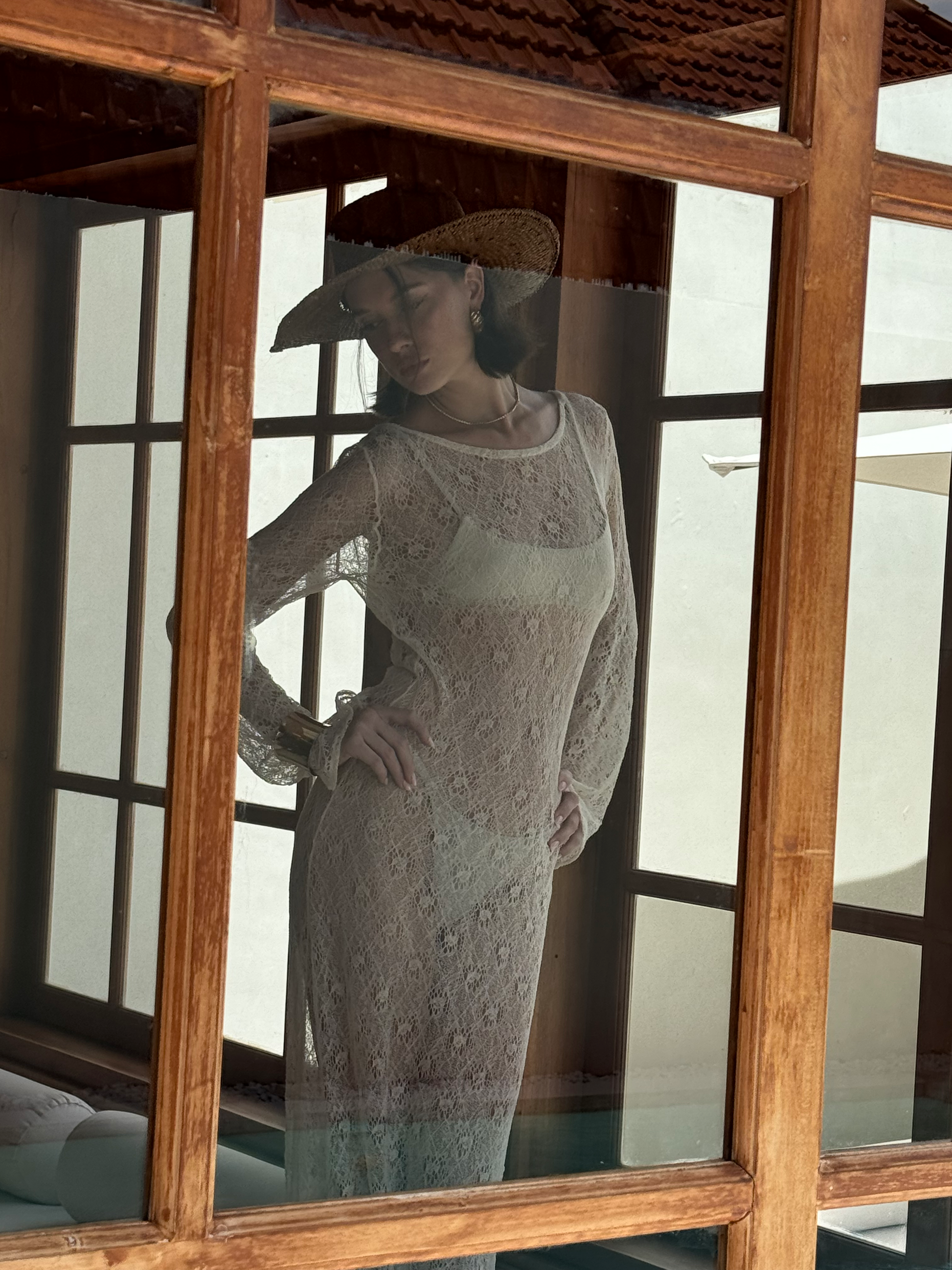 This transparent dress is crafted from various lace pieces that change each season. It can be worn over a swimsuit or opaque underwear. Made in Bali